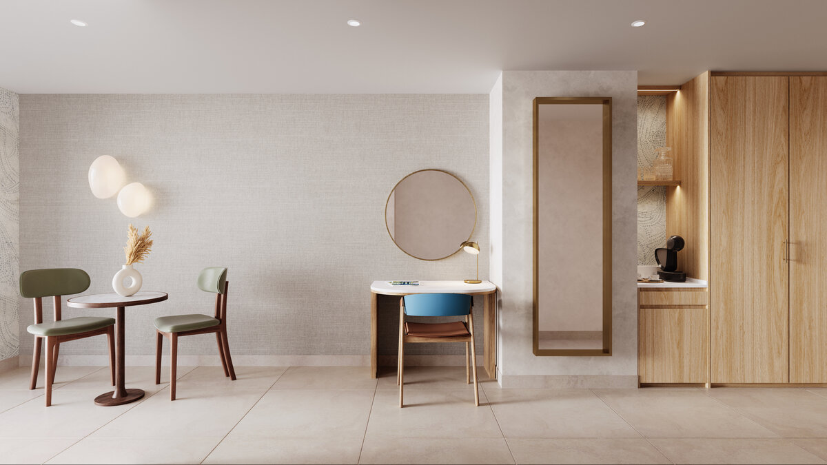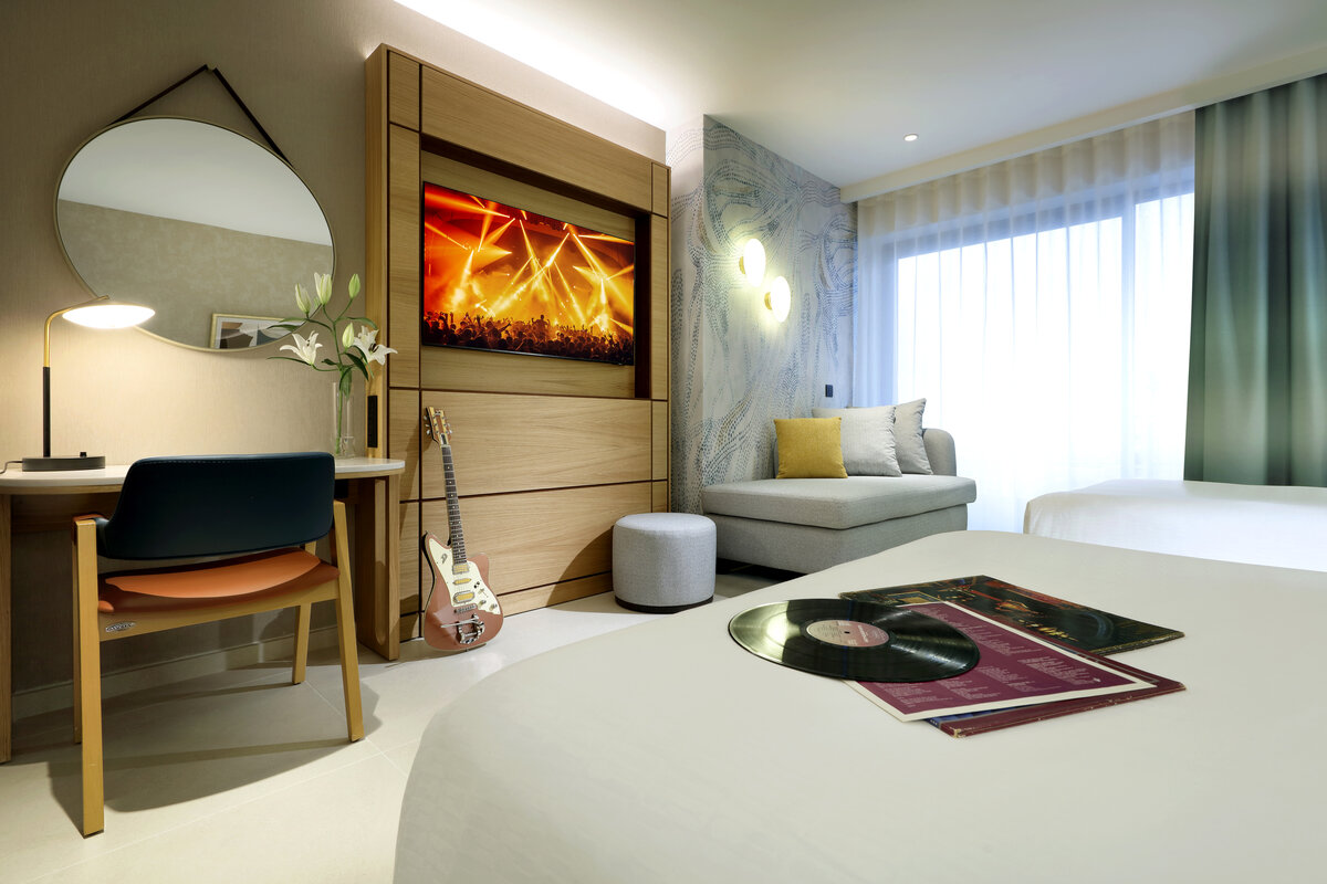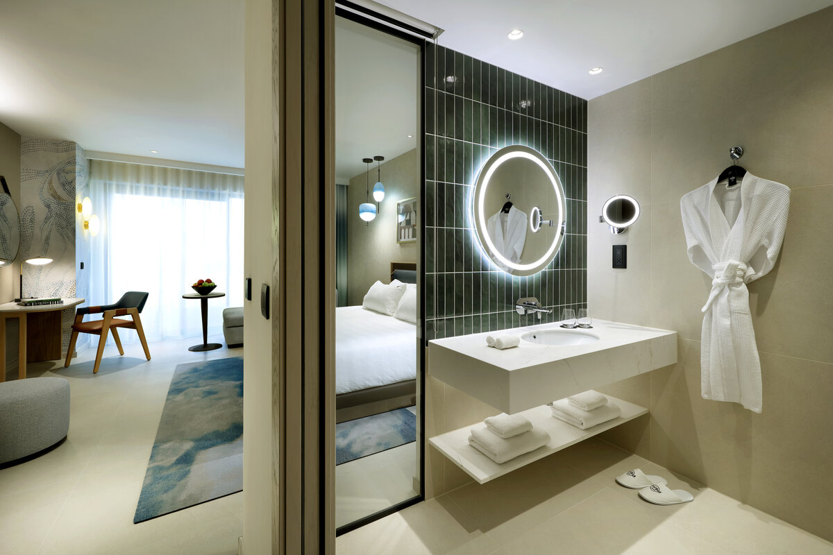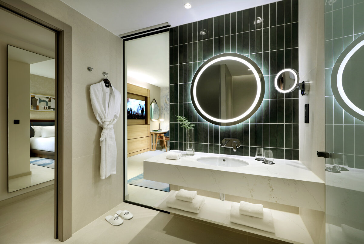 Discover comfort and ease in our Accessible Rooms, thoughtfully designed for effortless movement without sacrificing style. Spacious layouts, step free access, and wider doorways create a relaxed flow, while music inspired interiors set a calm, modern mood. Select rooms feature Mediterranean views, a private balcony, and accessible bathrooms with roll in showers and supportive grab bars. Club access is available for guests seeking added services and a more refined stay.