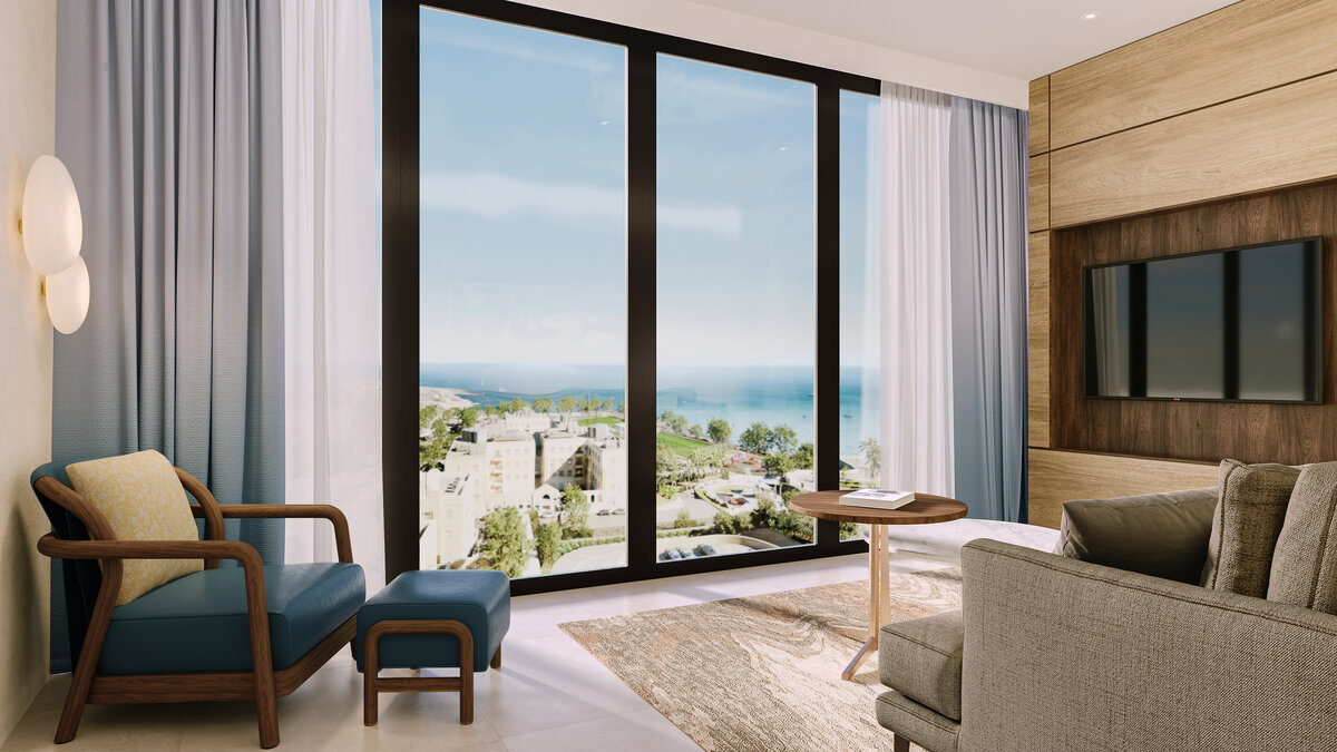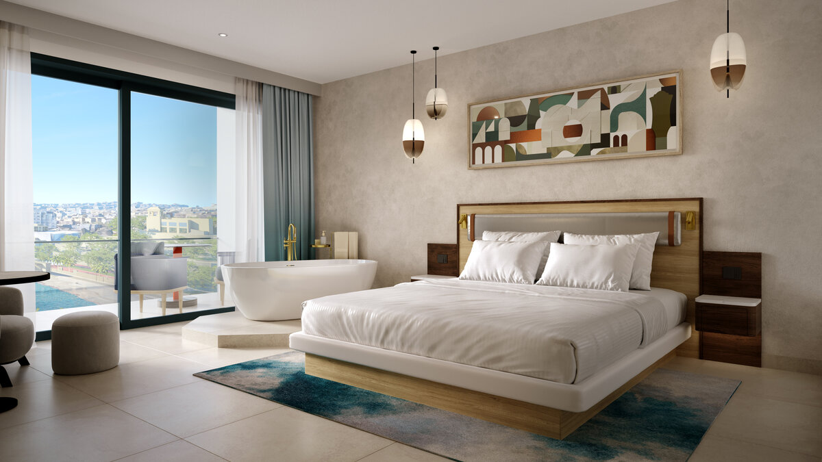 Set your own pace in our Deluxe Rooms, where bright interiors and sweeping Mediterranean views create an easy sense of escape. Floor to ceiling windows and a private balcony invite quiet mornings and sunset pauses, while plush bedding and subtle music inspired details set the mood for unwinding. Select rooms feature a freestanding jetted tub and Club Services, adding privacy, comfort, and a more elevated stay experience.