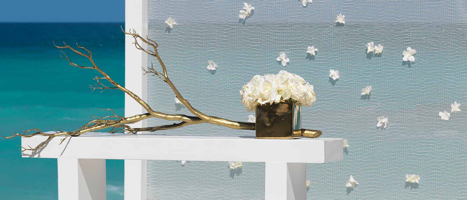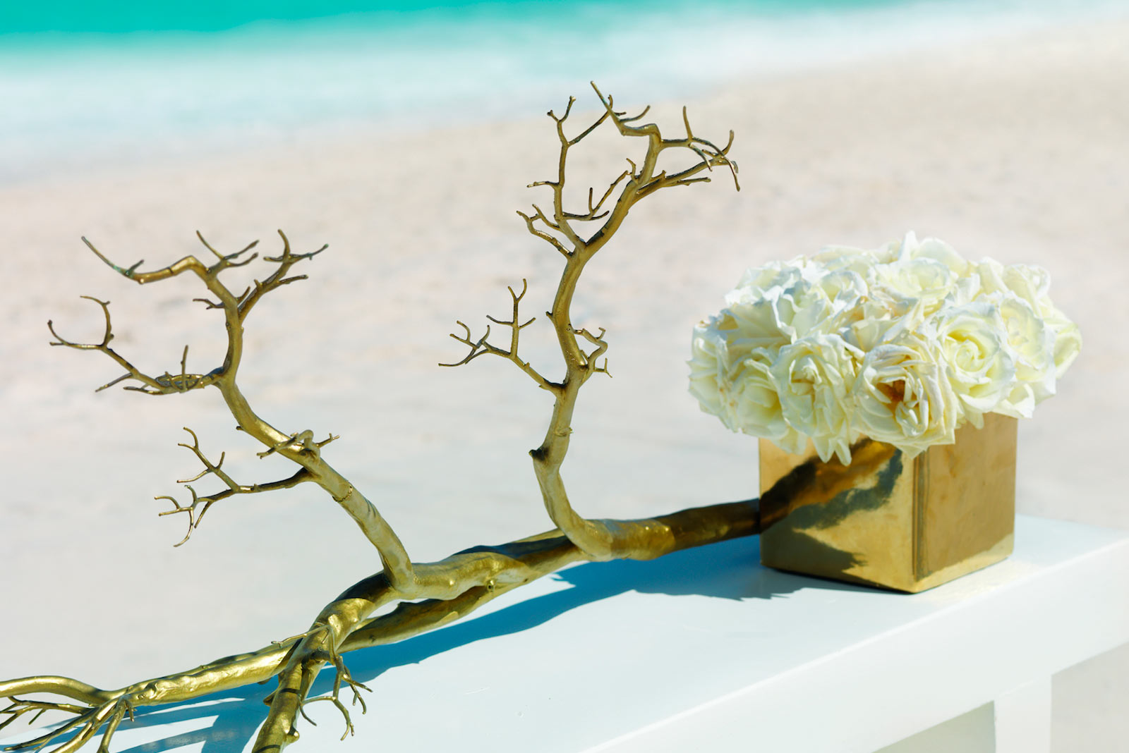 The complimentary inspiration allows you and your love to shine with its understated elegance. The natural sand aisle, white seating and altar, and simple floral arrangement are the perfect complements to your day.