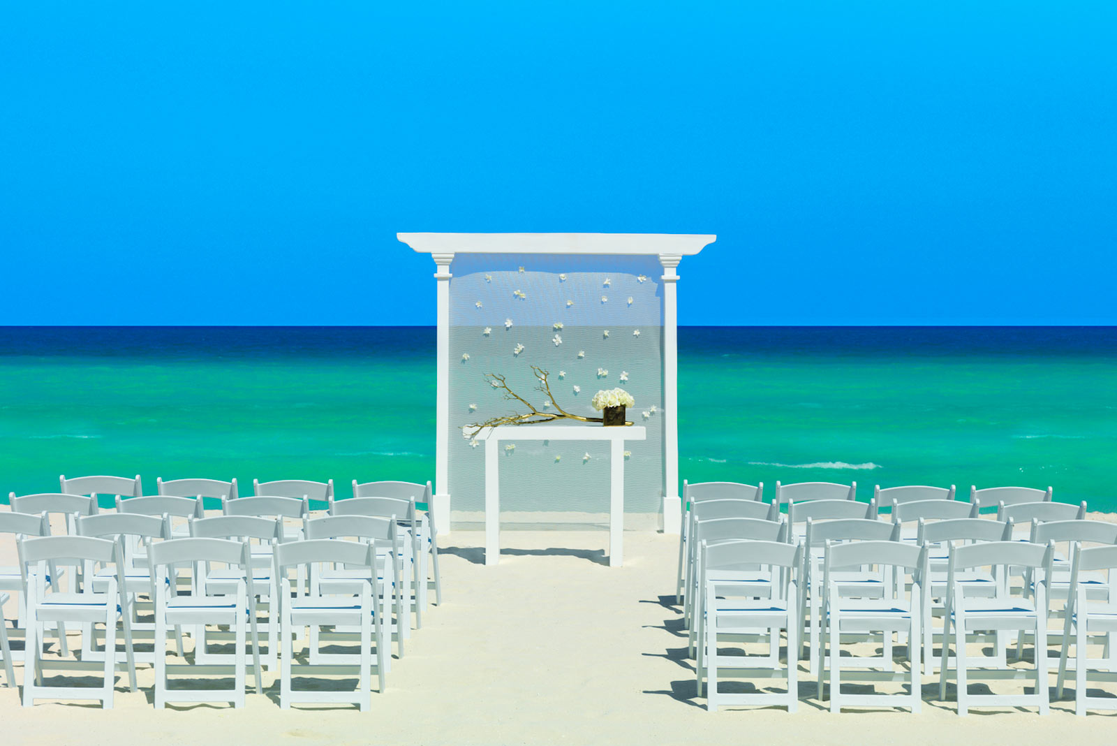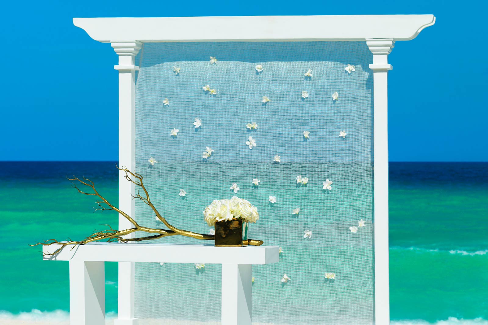 La colección complementaria les permite brillar a ti y tu pareja con una sobria elegancia. El pasillo natural de arena, sillas y altar blancos así como arreglos florales simples complementarán tu día.