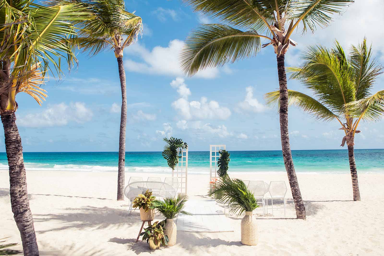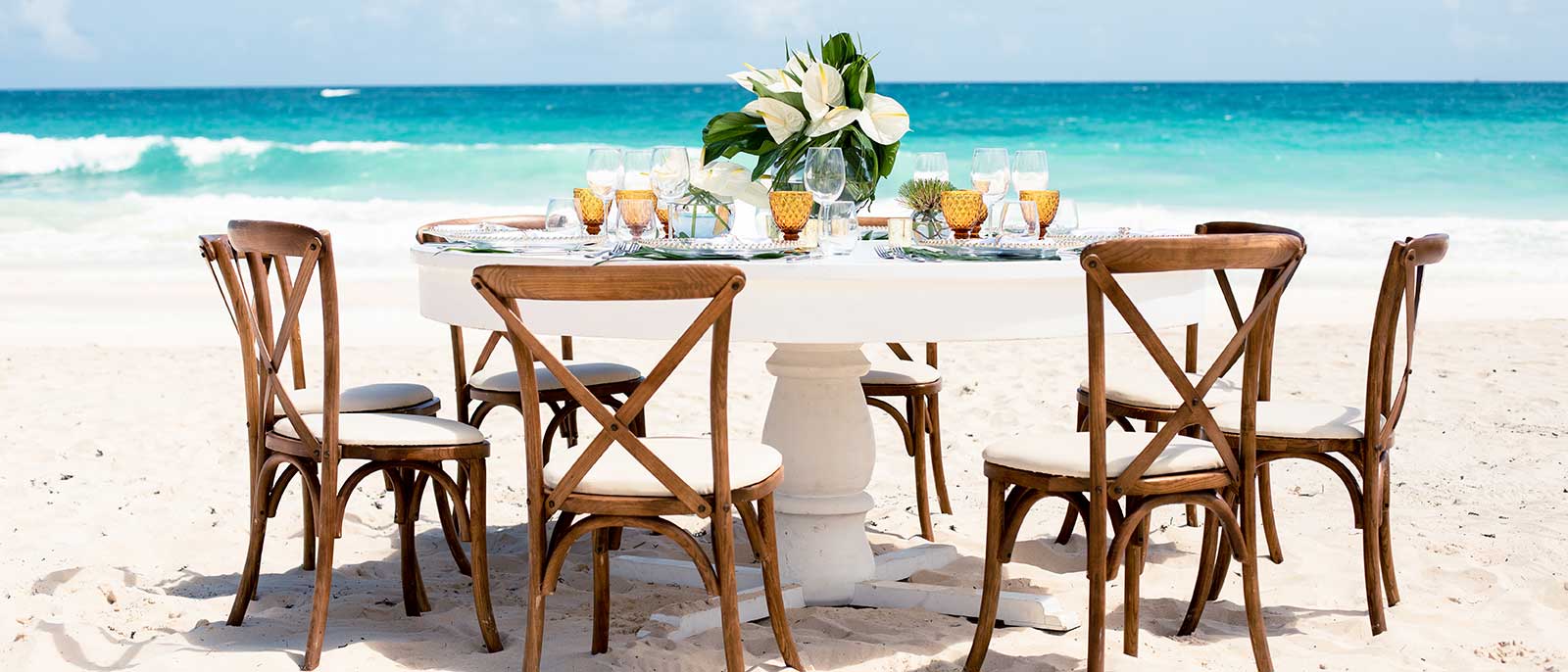 Elegante en su simplicidad, nuestra colección Tropical aporta la belleza natural de su entorno como protagonista de su gran día con sus vibrantes centros de mesa florales y toques dorados.
