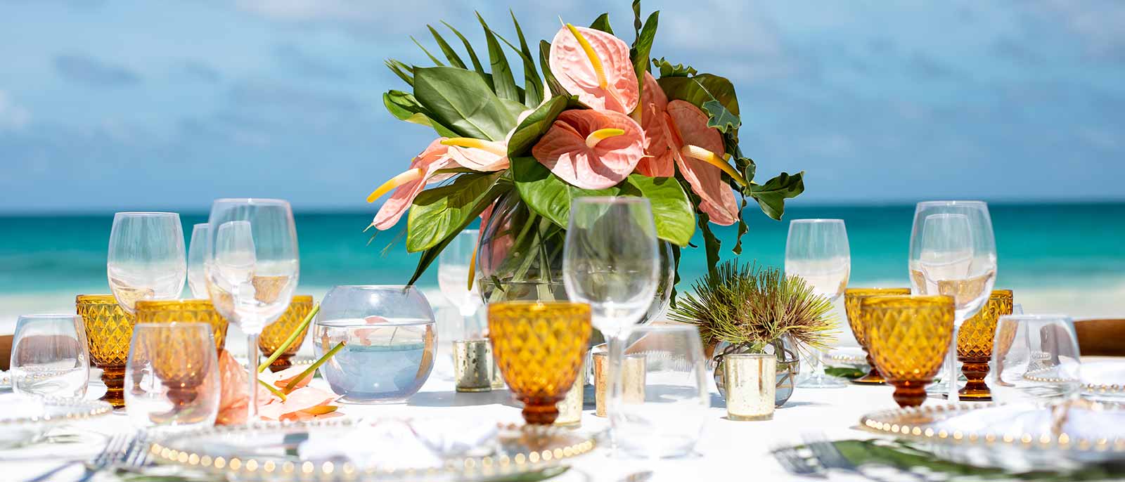 Elegant in its simplicity, Tropical Paradise brings the natural beauty of your surroundings front and center into your big day with its vibrant floral centerpieces and golden touches.